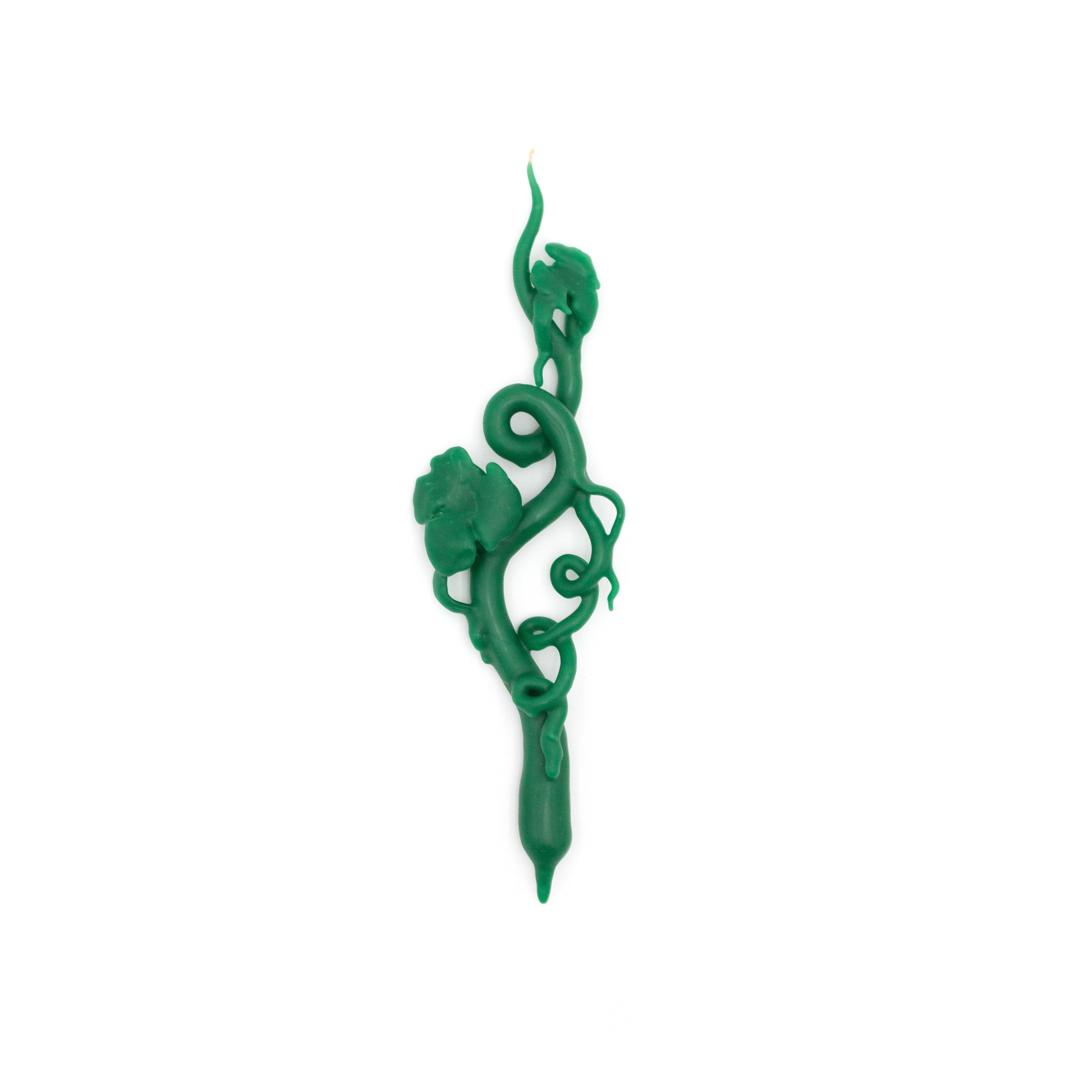 This hand dipped, beeswax candle features multiple wicks and curlycue vines. Before using with a candleholder, please adjust the base of candle by cutting and heating it with a flame for a snug fit.